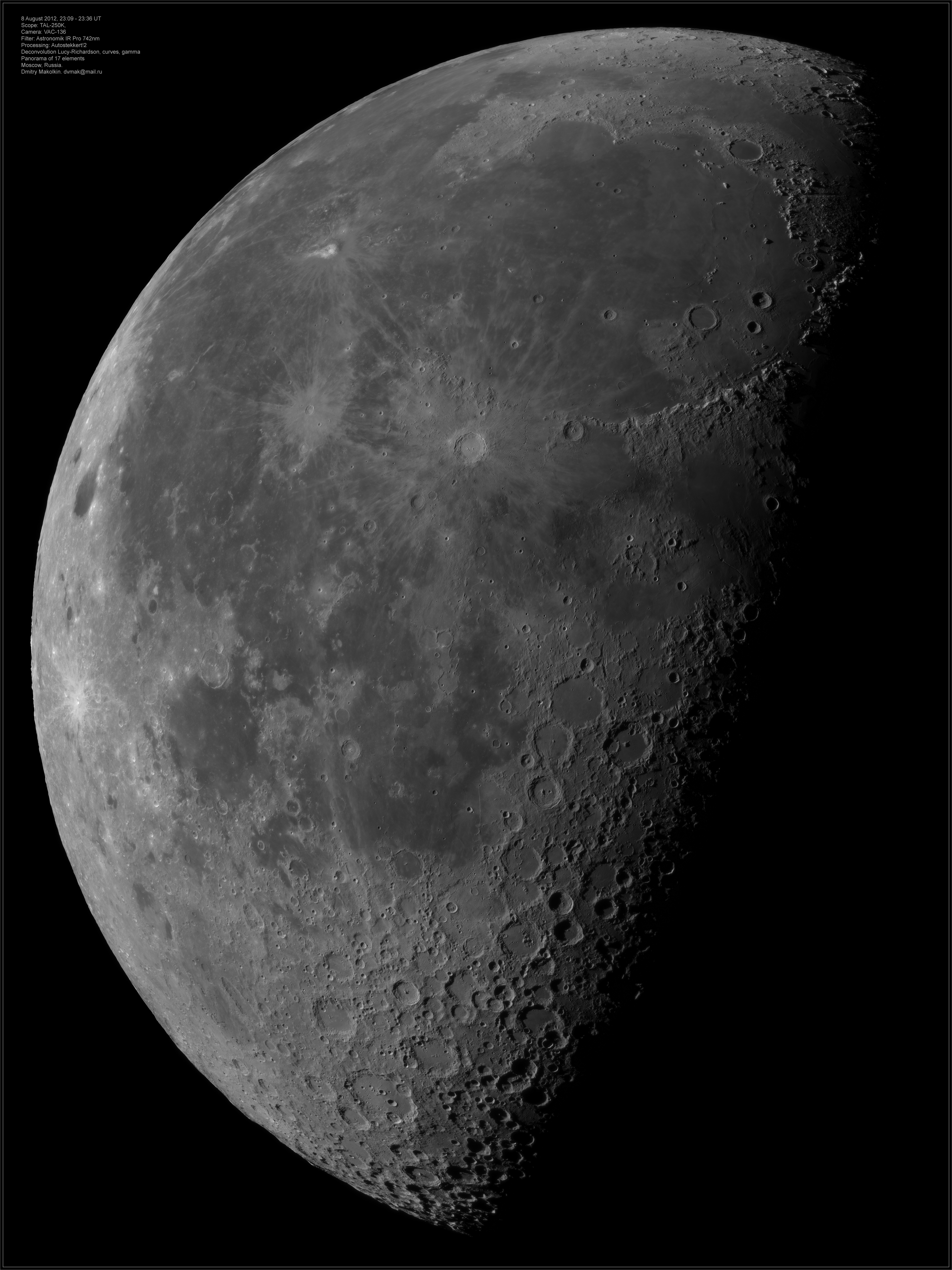 Moon panorama, 9 August 2012. Scope: TAL-250K. Filter: Astronomik IR Pro 742nm Registax 6, 250/2500 Deconvolution Lucy-Richardson, curves, gamma Panorama of 17 elements.