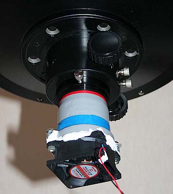 | Here is a ventilation assembly, I have made it of car air filter of suitable size. 12V ventilator for computer and a piece of plastic tube that fits 2" focuser. Design is obvious and very useful: |